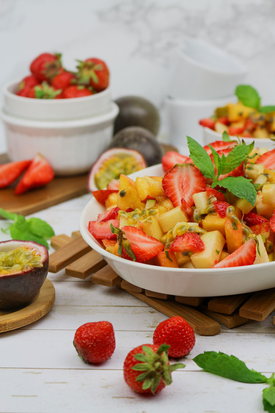 Tropiskie augļu salāti – kaut kas visiem augļu mīļotājiem! Ja vēl nekad neesat gatavojuši augļu salātus, tagad ir īstais laiks izmēģināt šo gardumu, jo tā patiešām ir nepārspējama uzkoda. Patīkami salds un pikants tropu marakujas (pasifloras auglis) aromāts apvienojumā ar atsvaidzinošu piparmētru un sulīgiem augļiem veido kombināciju, ko vienkārši nedrīkst palaist garām. Tāpat šo krāsaino bļodiņu lieliski var iepakot ballītei vai vasaras piknikam. Lūk, recepte, lai jūs varētu sākt!