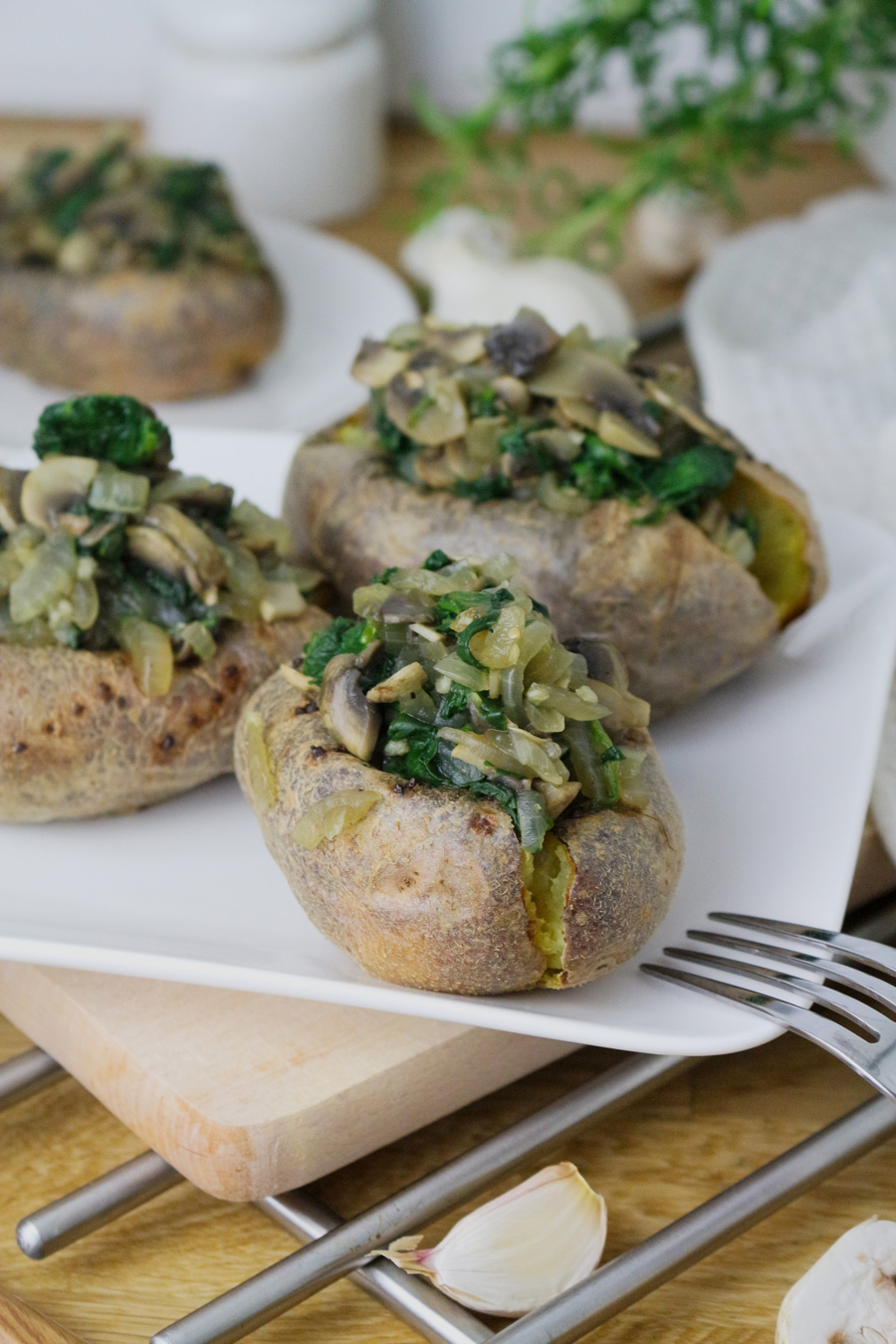 Uzkarsē cepeškrāsni līdz 180 grādiem un izklāj cepamo papīru. Pēc tam nomazgājiet un nosusiniet kartupeļus un novietojiet tos uz cepešpannas, kas izklāta ar cepamo papīru. Kartupeļus nemizojiet! Ar dakšiņu ieduriet kartupeļos dažus caurumus (veiciet 6–7 dūrienus). Tādā veidā kartupeļi labāk izcepsies. Lieciet kartupeļus cepeškrāsnī un cepiet 180 grādos aptuveni 60 minūtes vai līdz tie ir mīksti. Kamēr kartupeļi cepas, pagatavojiet pildījumu. Tam uz pannas lieciet sagrieztas sēnes. Sautējiet ar nedaudz ūdens vai buljona aptuveni 7–10 minūtes, līdz sēnes ir gandrīz gatavas. Pēc tam pievienojiet sīpolus un sasmalcinātus ķiplokus un sautējiet vēl 3–4 minūtes, ik pa laikam apmaisot, līdz sīpoli ir mīksti. Kā pēdējo soli pievienojiet sasmalcinātus spinātus. Cepiet maisījumu vēl 1–2 minūtes un pievienojiet garšvielas.