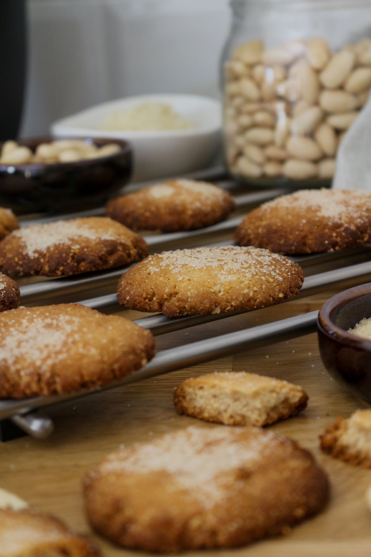 Uzkarsē cepeškrāsni līdz 180 grādiem un izklāj cepamo papīru. Vidēji lielā bļodā sajauc kopā mandeļu miltus, tapiokas cieti un cepamo pulveri. Pievieno izkusušo kokosriekstu eļļu un kļavu sīrupu. Maisiet, līdz izveidojas bieza mīkla. Ja mīkla šķiet pārāk mitra, pievienojiet vēl nedaudz mandeļu miltu. Tad ielieciet mīklu ledusskapī uz 15 minūtēm, lai tā nostāvētos.
