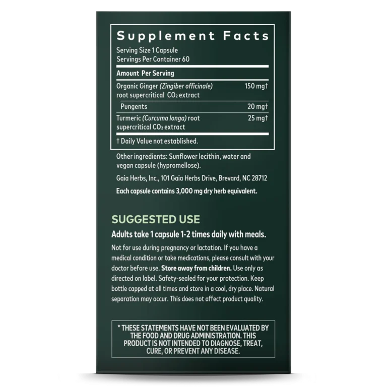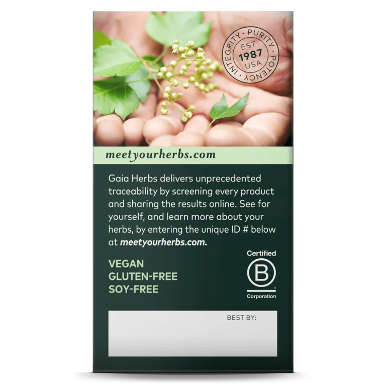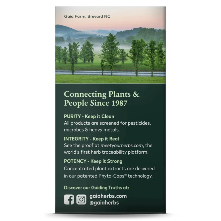 Nesatur: Kukurūzu, piena produktus, glutēnu, riekstus, čaulgliemjus, soju, cukuru, raugu. Visi Gaia Herbs produkti ir pārbaudīti uz pesticīdu, mikrobu un smago metālu klātbūtni.