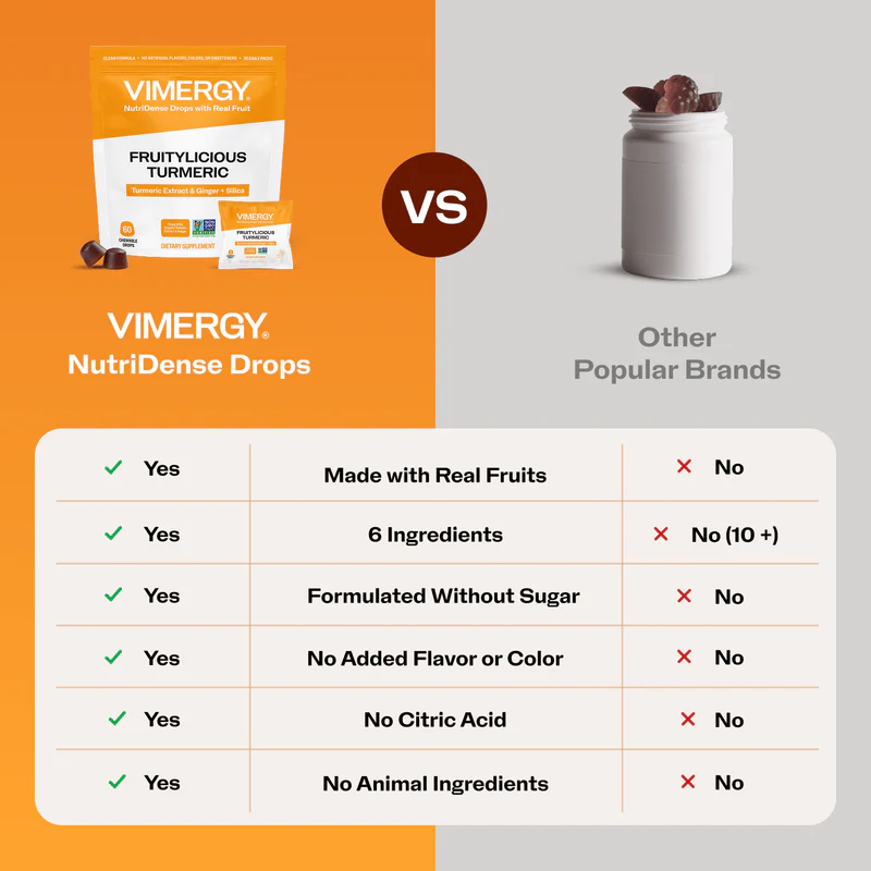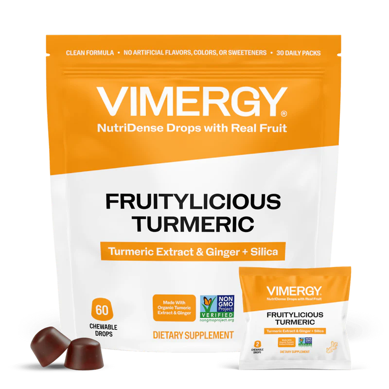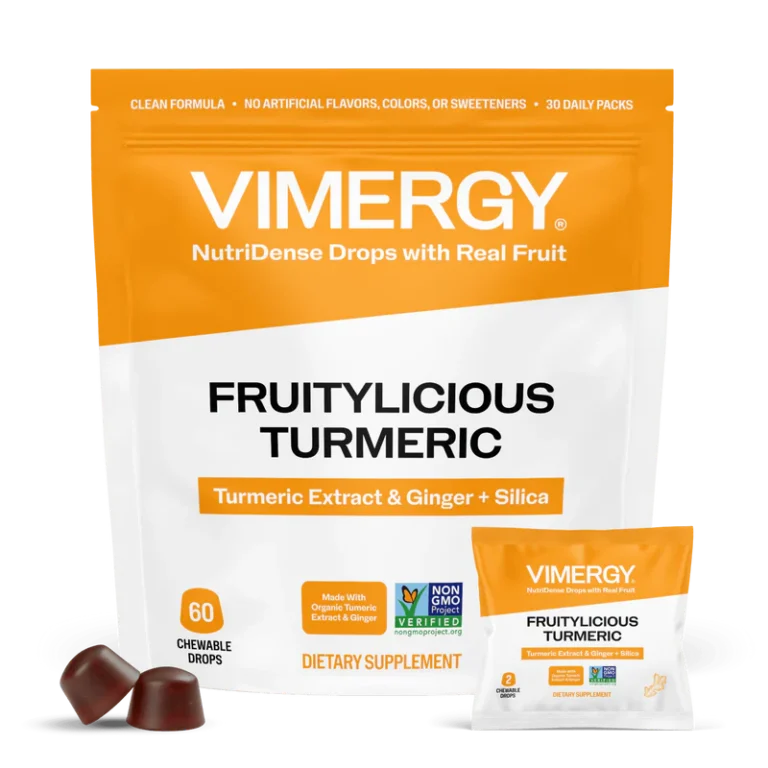 Vimergy uzturvielām bagātie augļu kumosiņi (Fruitylicious Turmeric Drops) – tavu locītavu ikdienas atbalsts