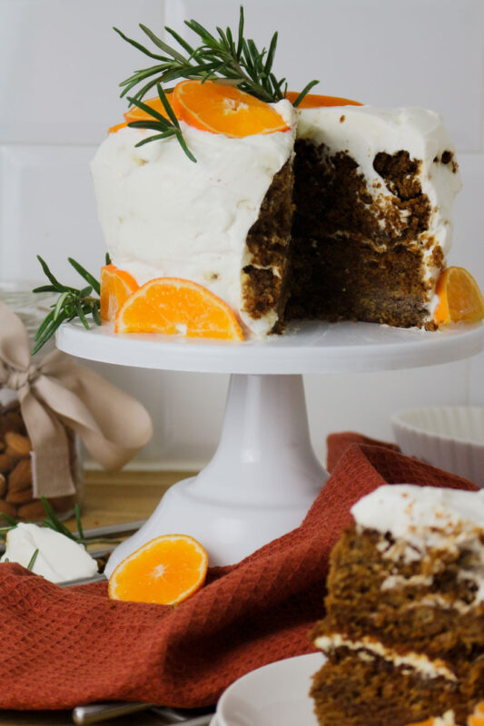 Svētku pilngraudu krējuma kūka ar apelsīnu šķēlītēm un kokosriekstu krējuma mērci